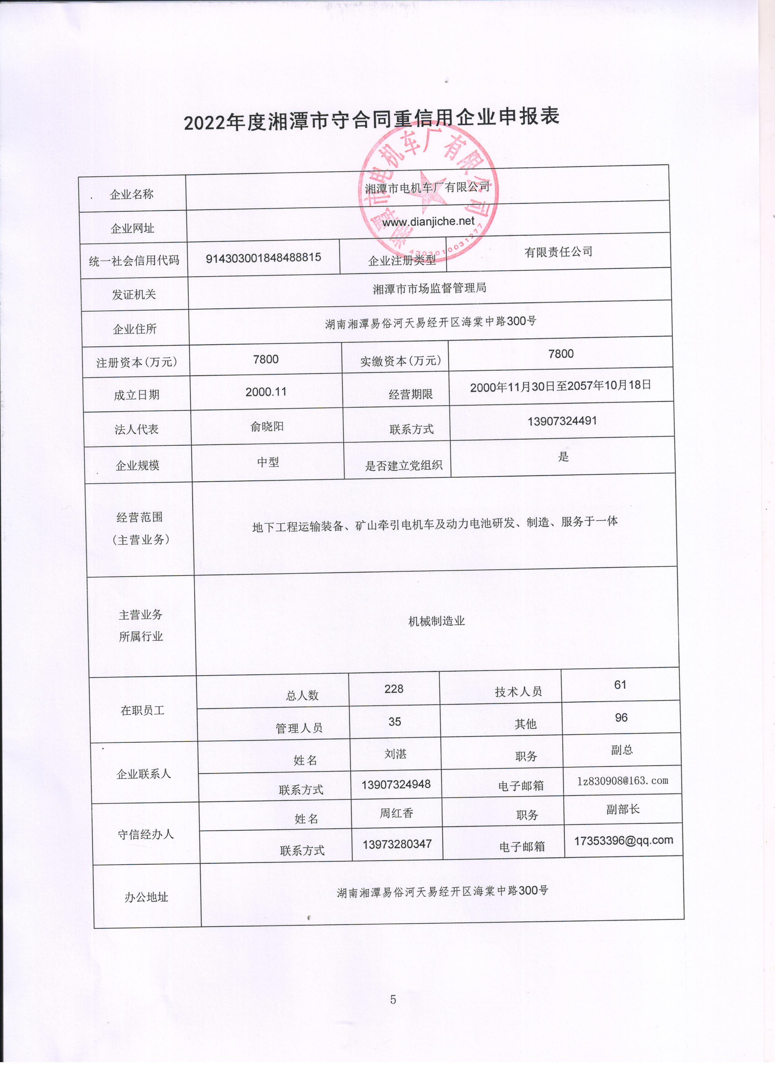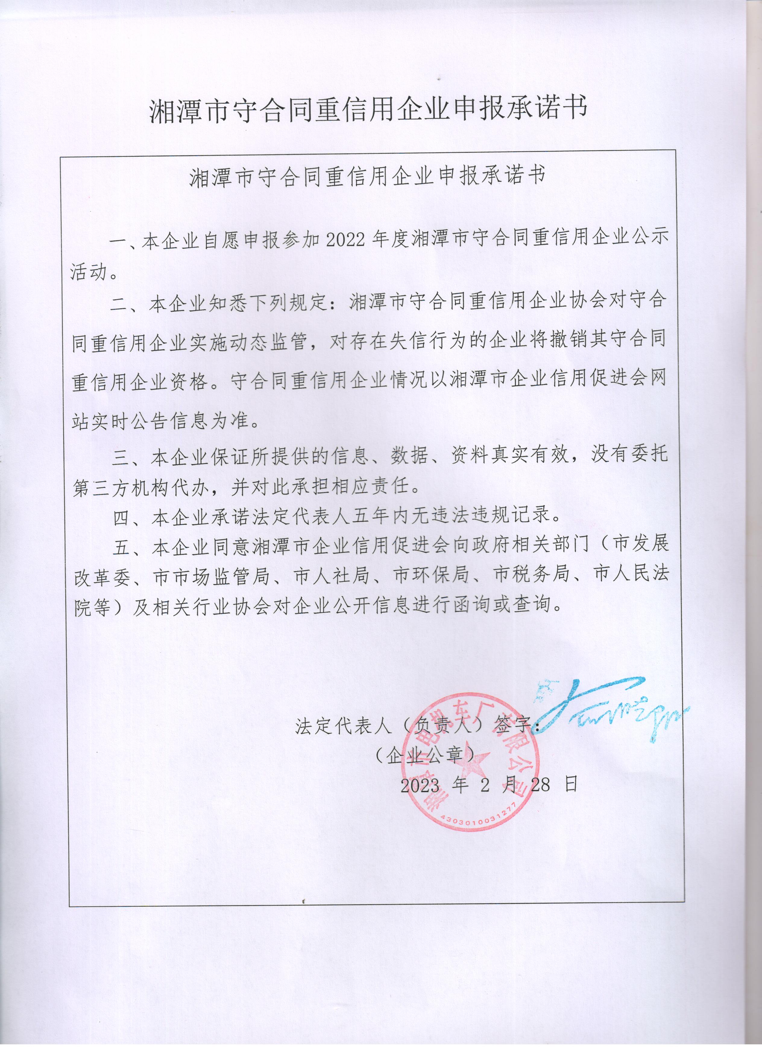 本企業(yè)根據(jù)《湘潭市守合同重信用企業(yè)申報規(guī)定》等編制 2022 年度企業(yè)信用報告書,并保證本報告書內容真實、準確、完整。